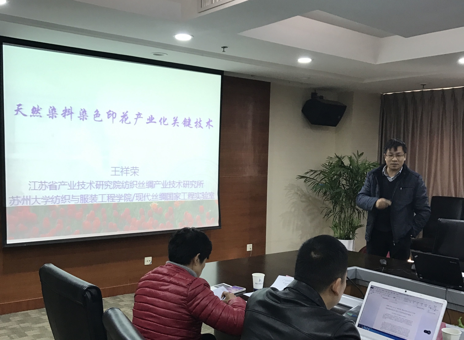 王祥荣教授就《天然染料染色印花加工技术及产品》的研究进行了介绍,此项目主要研究应用天然色素作为纺织品染料,涉及天然染料的提取,拼色、印花等技术,还包括天然染料染色印花产品的抗菌、防螨等功能性开发。王教授现场展示了天然染料染色的产品,与会企业代表们给出了较高的评价。