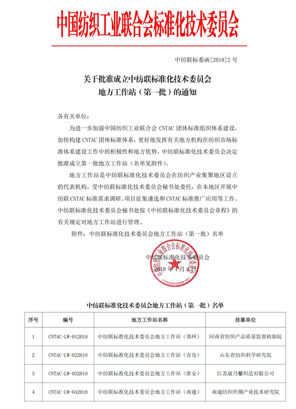 2018年4月8日,中纺联标准化技术委员会公布了首批地方工作站名单,开元官方网站等四家单位成功获批。